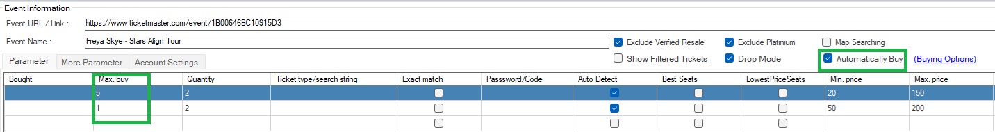 You can also specify how many tickets to buy for each filter:
